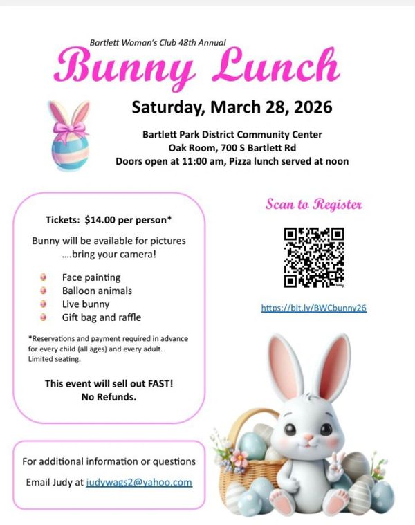Our monthly meeting for the community organization, Bartlett Women's Club, takes place on the first Tuesday of each month from September to May at the Bartlett Park District Log Cabin located at 102 N Eastern Ave, Bartlett. Please check the Calendar of Events tab or the Bartlett Women's Club Facebook page for any updates on time or location changes.